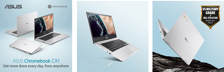 ASUS Chromebook CX1 втілює чистий стиль та портативність з легким корпусом масою 1,47 кг і характерним сучасним виглядом. З підсиленою конструкцією для підвищення міцності корпусу ASUS Chromebook CX1 надійно збудований і забезпечує довговічність під час всіх ваших подорожей. Він також відповідає вимогам випробувань за військовим стандартом MIL-STD 810H3, які є більш жорсткими і вимогливими, ніж будь-коли раніше. Крім того, пристрій перебуває під суворим внутрішнім тестуванням — включаючи випробування на тиск панелі, удари та падіння — для забезпечення максимальної міцності, тож ви можете не турбуватися через щоденні поштовхи і подряпини.